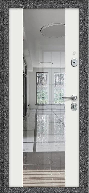 Надежная входная Дверь Браво Север-7 Антик Серебряный/Белый Зеркало премиум класса по цене 30 935 руб. Большая толщина стали защитит от проникновения в ваш дом, квартиру или коттедж. Используется очень качественная фурнитура: замки, цилиндры, ручки, защелки. Покрытие и отделка двери изготовлено под внимательным контролем производителя. Дверь имеет долгий срок службы и гарантию.